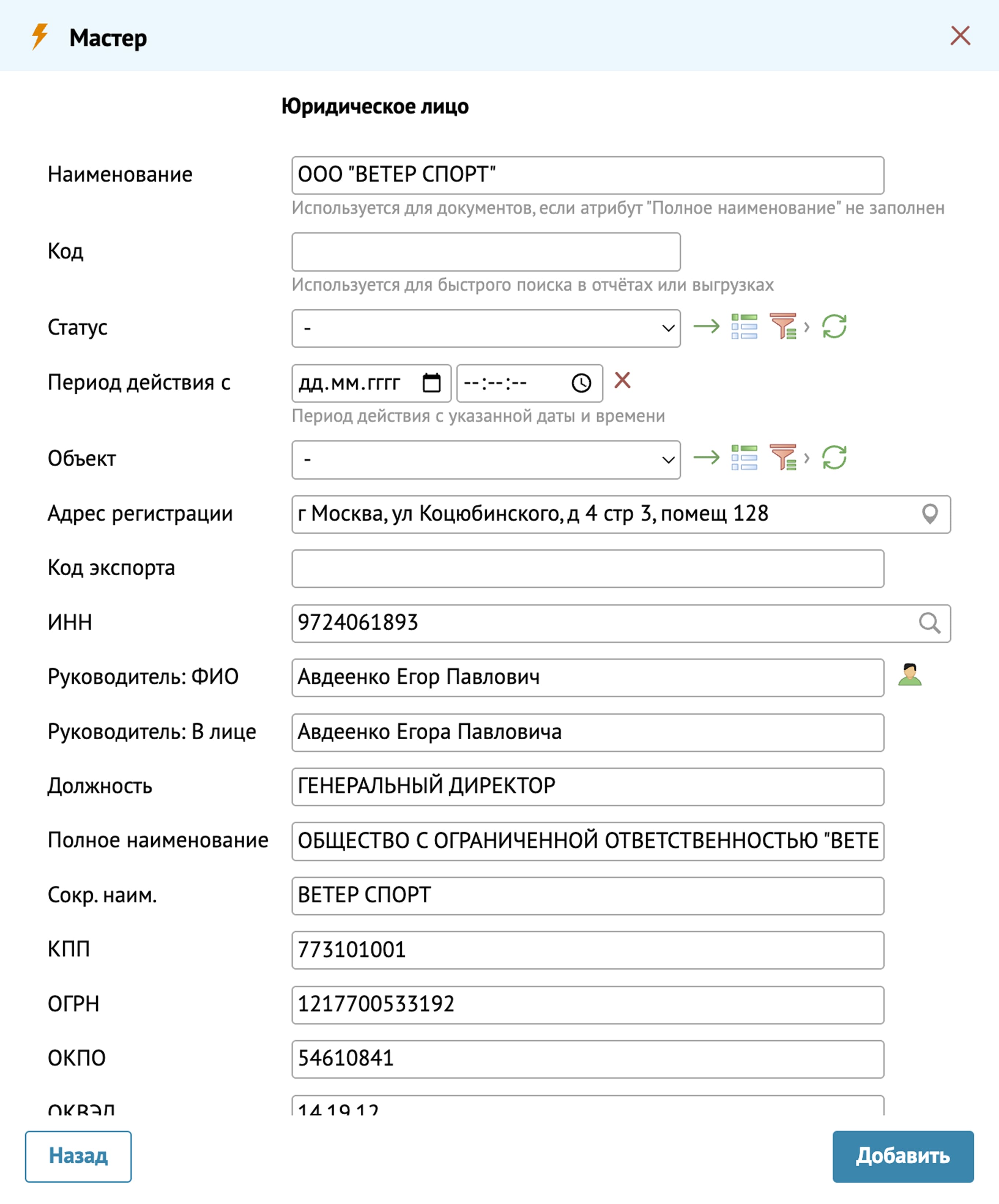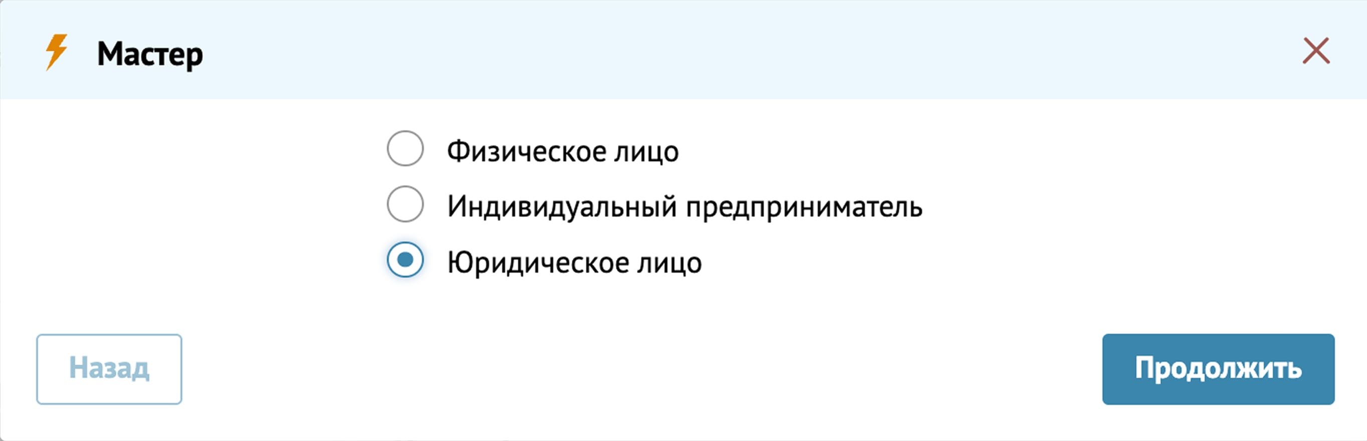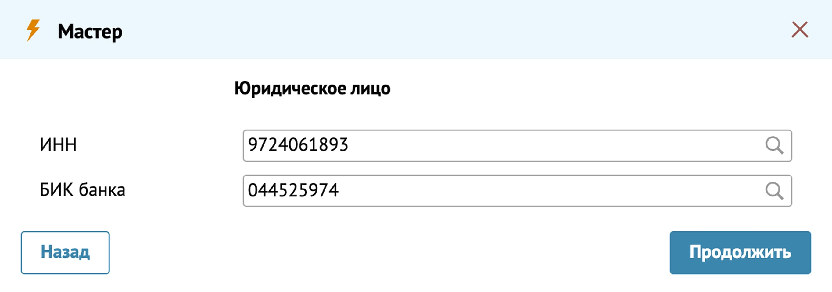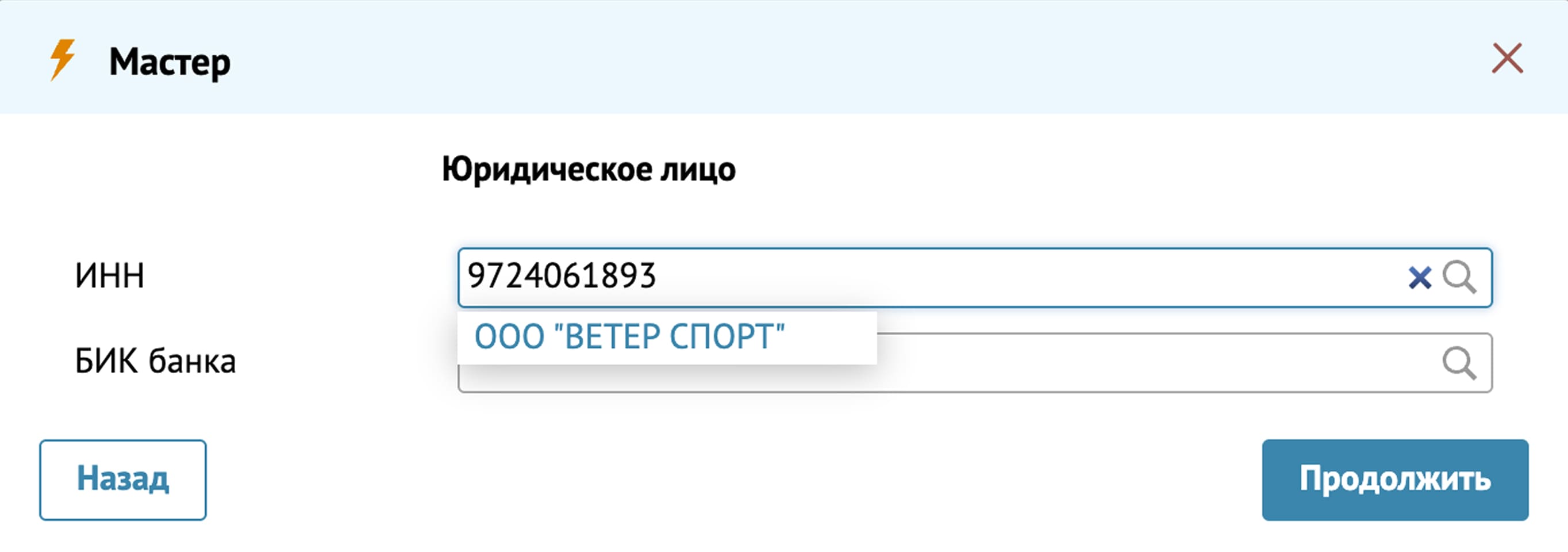 В окне Мастер сначала выбирается Тип клиента, например, юр. лицо. После этого нужно ввести ИНН: если подключен аккаунт Dadata.ru, система автоматически предложит название компании в выпадающем списке. Аналогично при вводе БИК сразу отобразится название банка. Остальные данные также подгружаются из Dadata.ru. При необходимости данные можно отредактировать.
