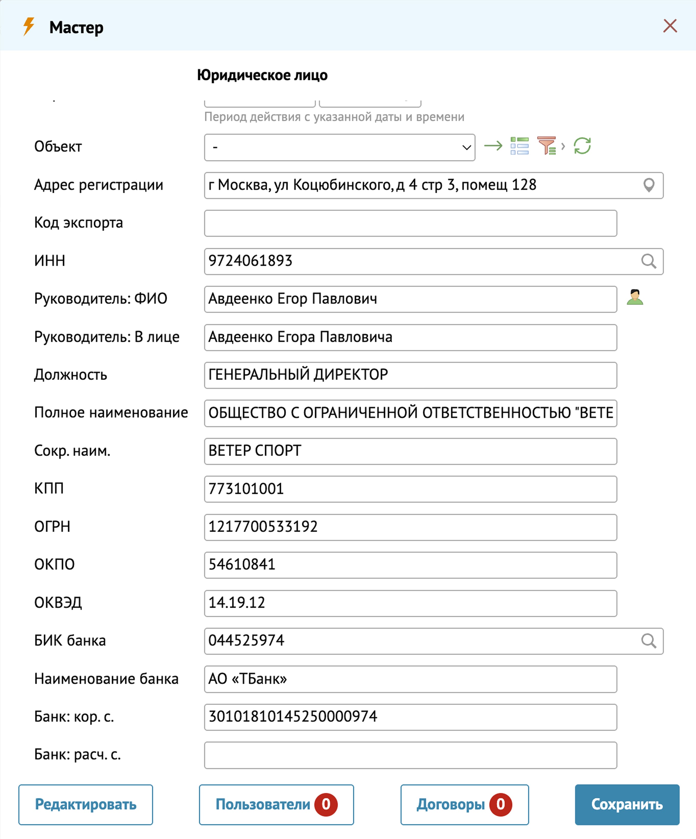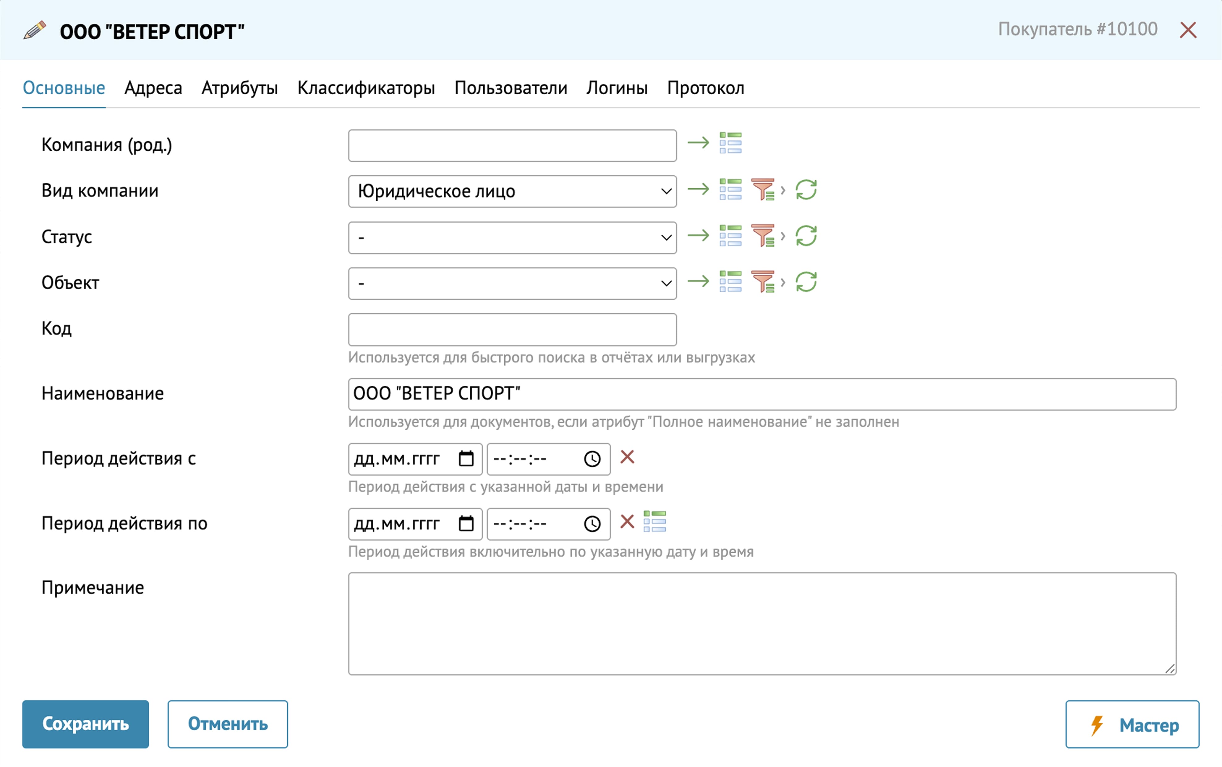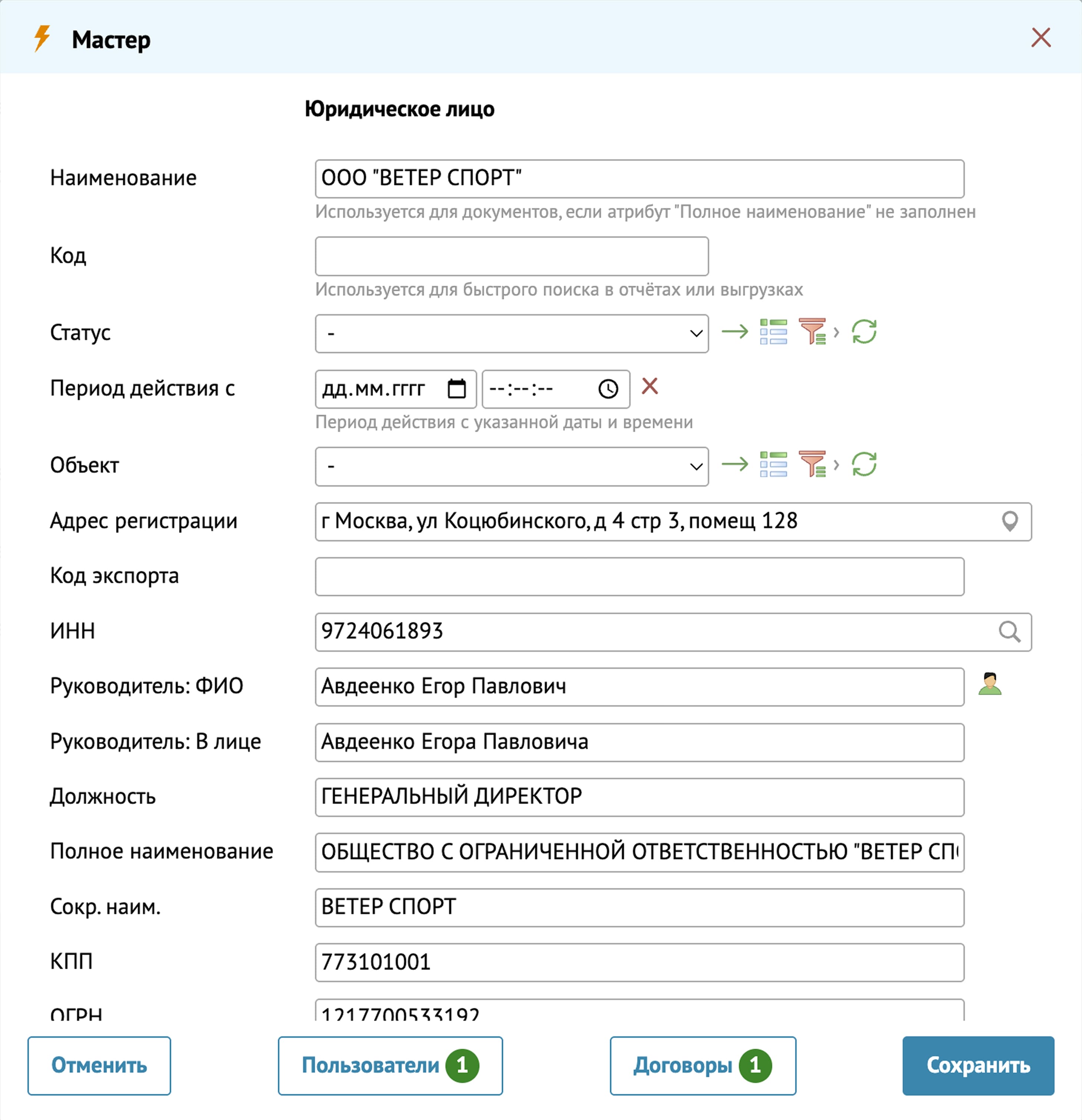 Для редактирования информации в окне Мастер нужно открыть запись на редактирование и нажать на кнопку Мастер или выбрать действие Мастер в контекстном меню.