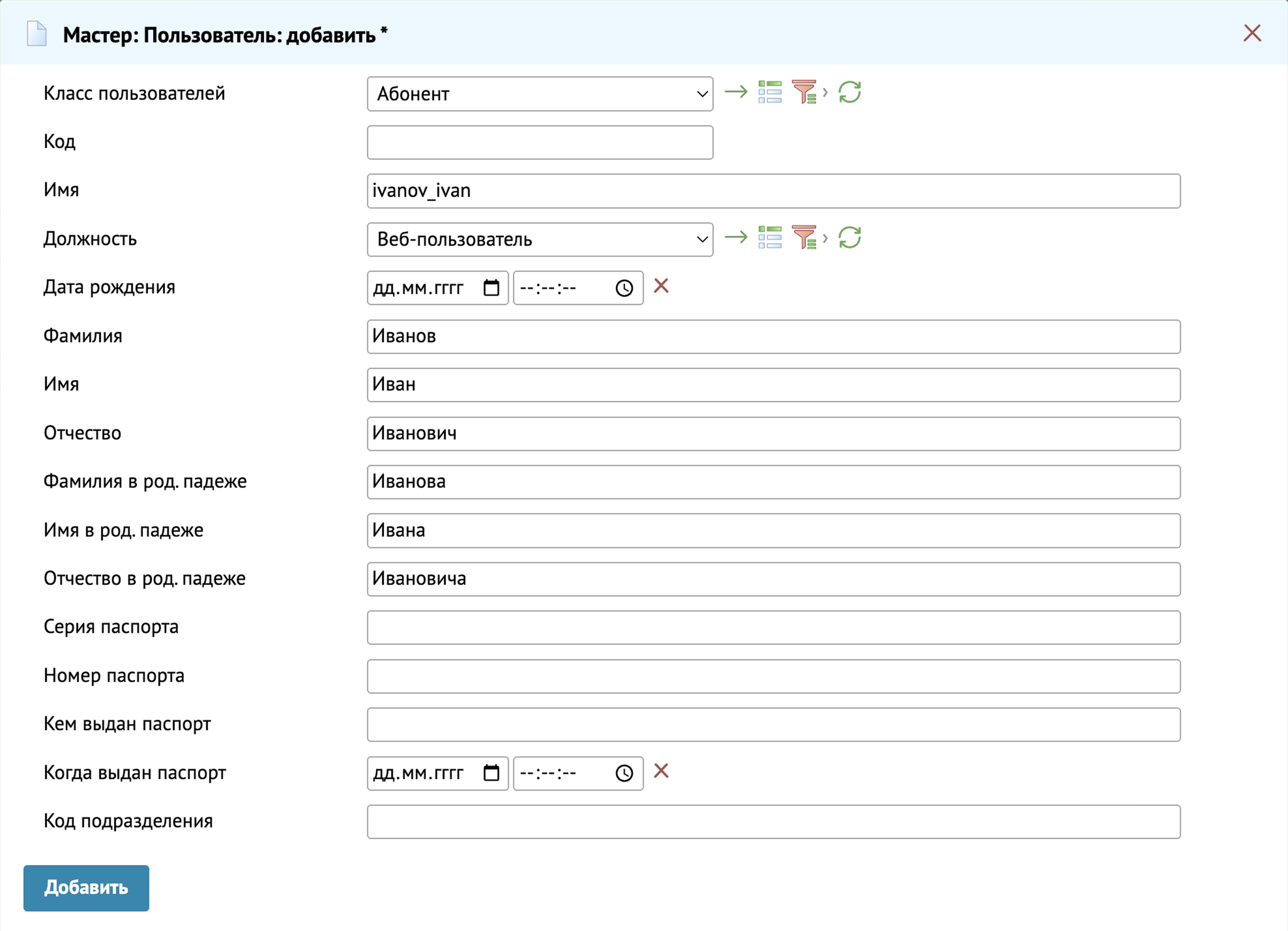 Затем необходимо нажать кнопку Добавить, и запись сохранится. После этого появляются дополнительные кнопки: Пользователи (абоненты, которые связываются с клиентом через Сотрудники/Компании в должности) и Договоры. После добавления Пользователя ему можно сразу создать учетную запись. В качестве Пользователя может также выступать контактное лицо, например, подписант для документов.