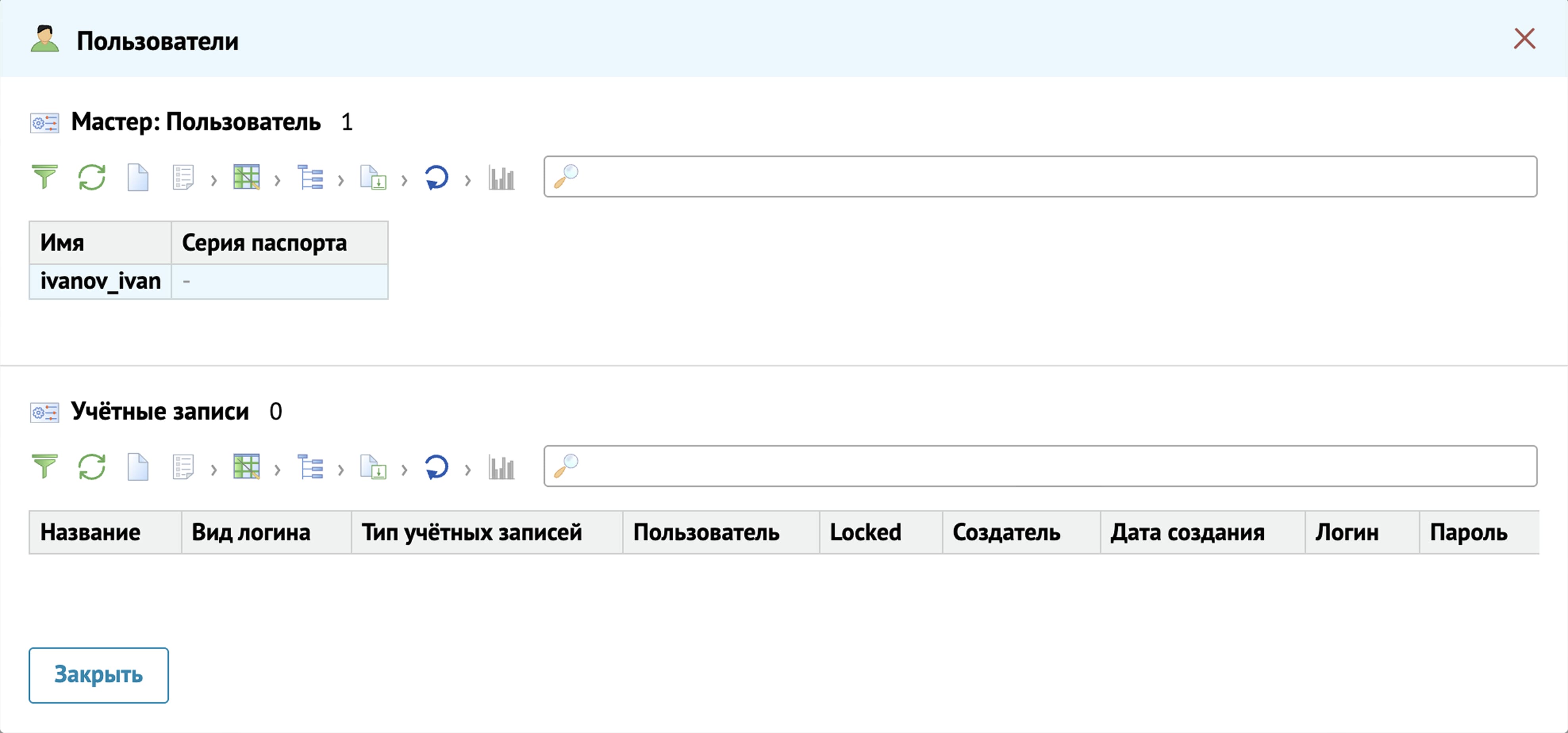 Создание учетной записи осуществляется во вкладке Служебное \ Учетные записи. Во вкладке отображаются все учетные записи: как служебные, так и учетные записи сотрудников.