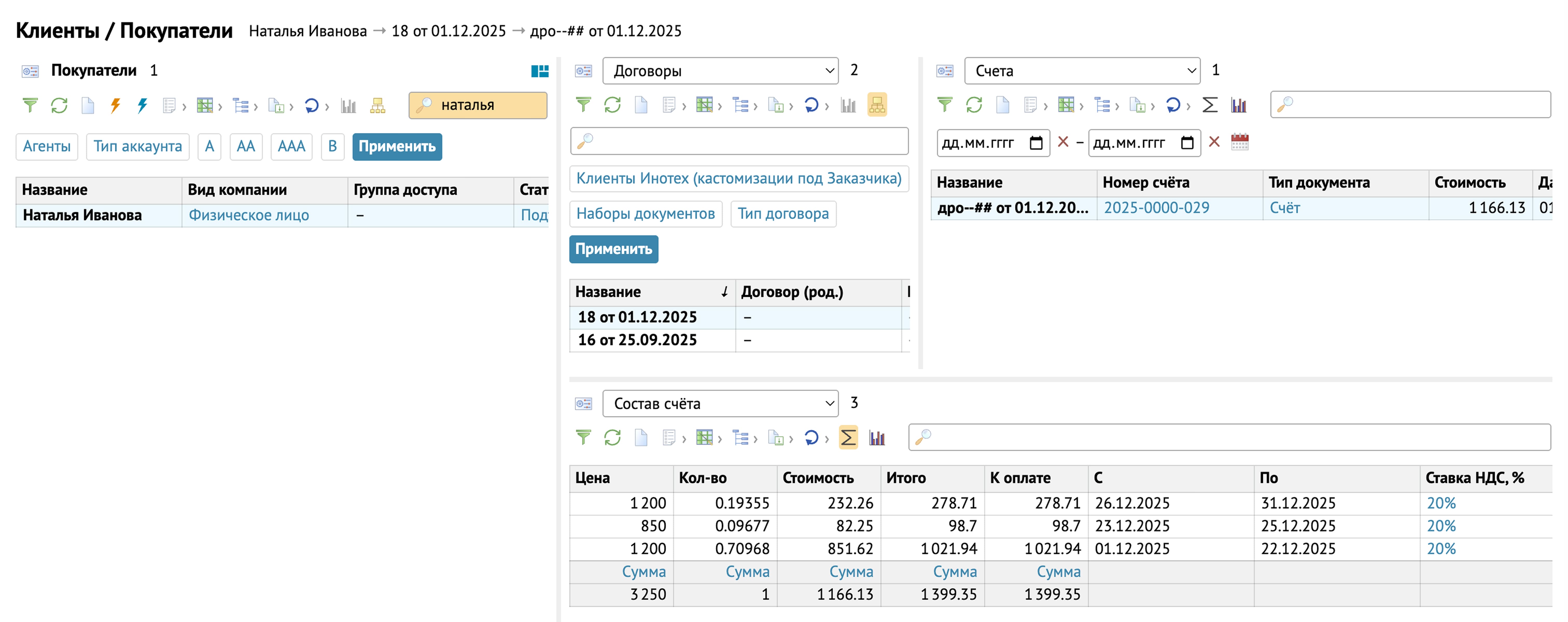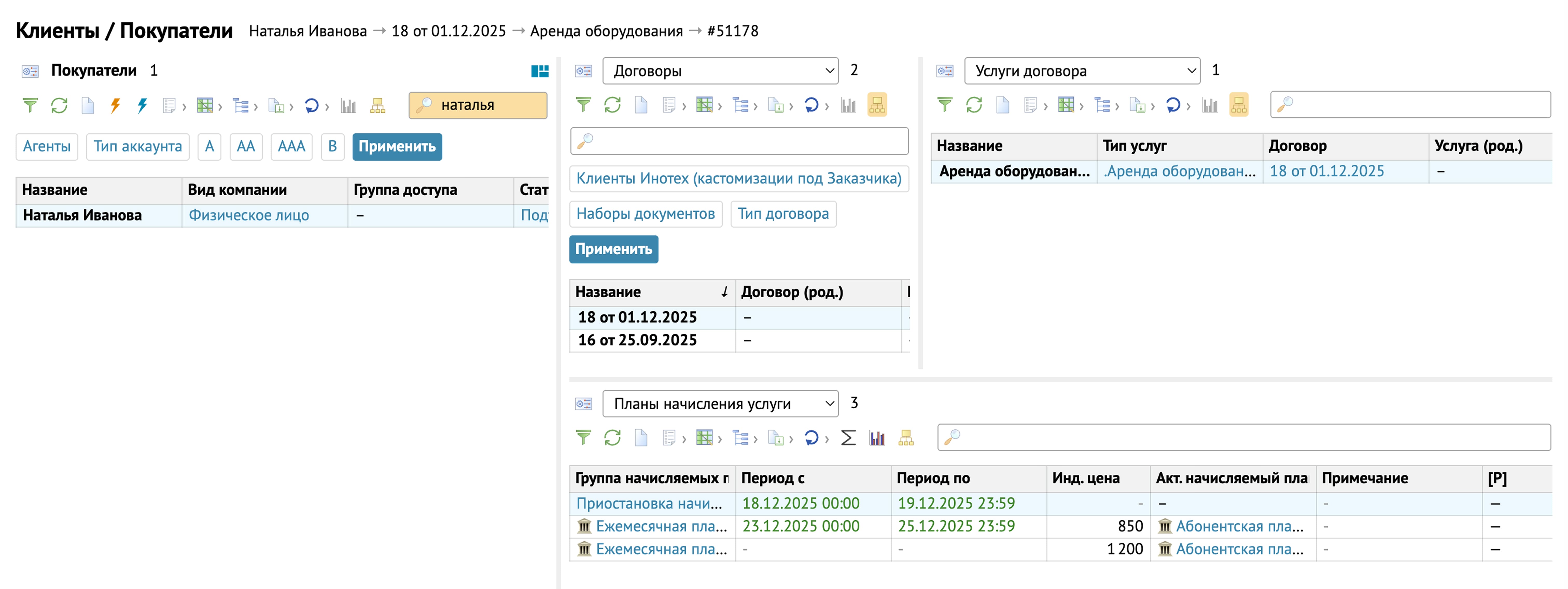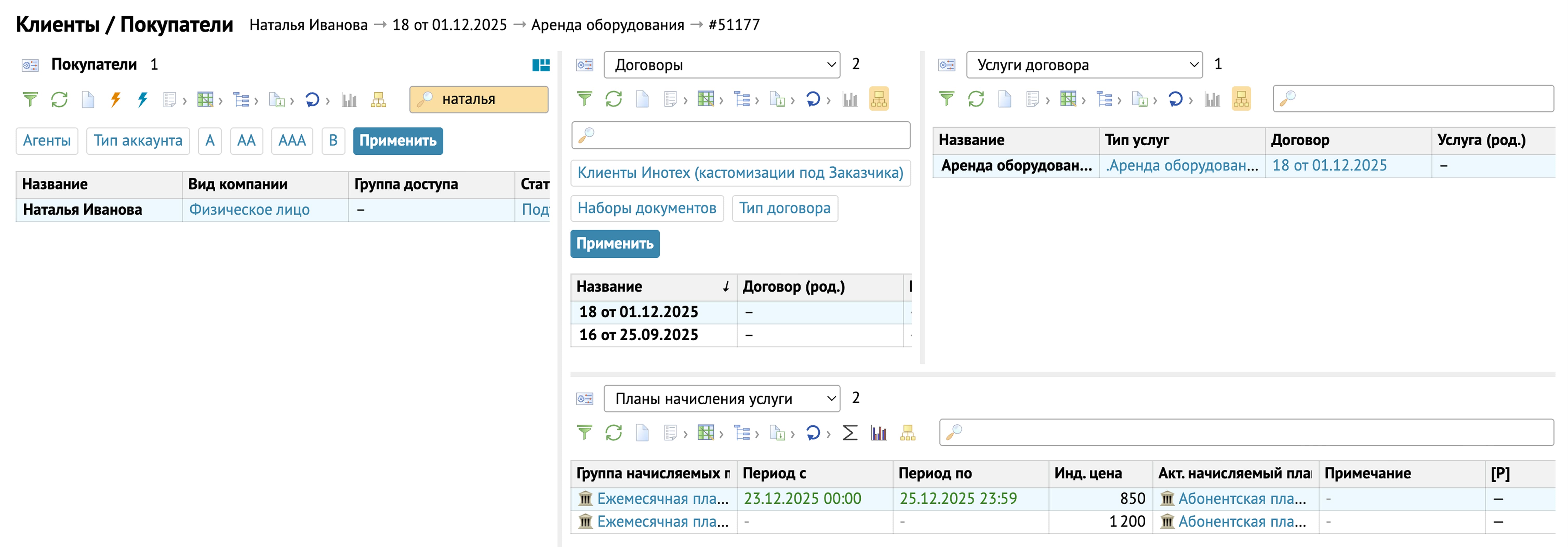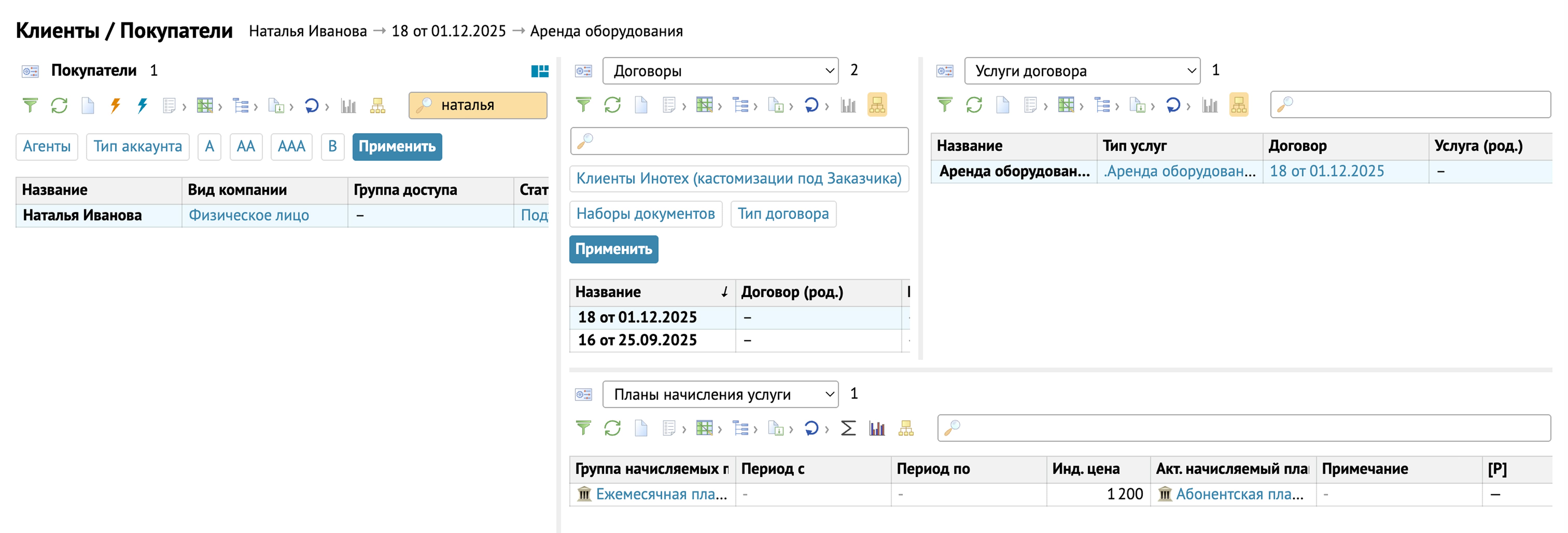 Шаг 1 — Пункт меню Клиенты \ Вкладка Покупатели \ Покупатель Иванов П.В. Нажимаем на Иванова П.В. и в выпадающих списках выбираем Договоры:Покупатель \ Услуги договора/Планы начисления услуги. Можно увидеть полную информацию по договорам, услугам и планам услуг данного покупателя.