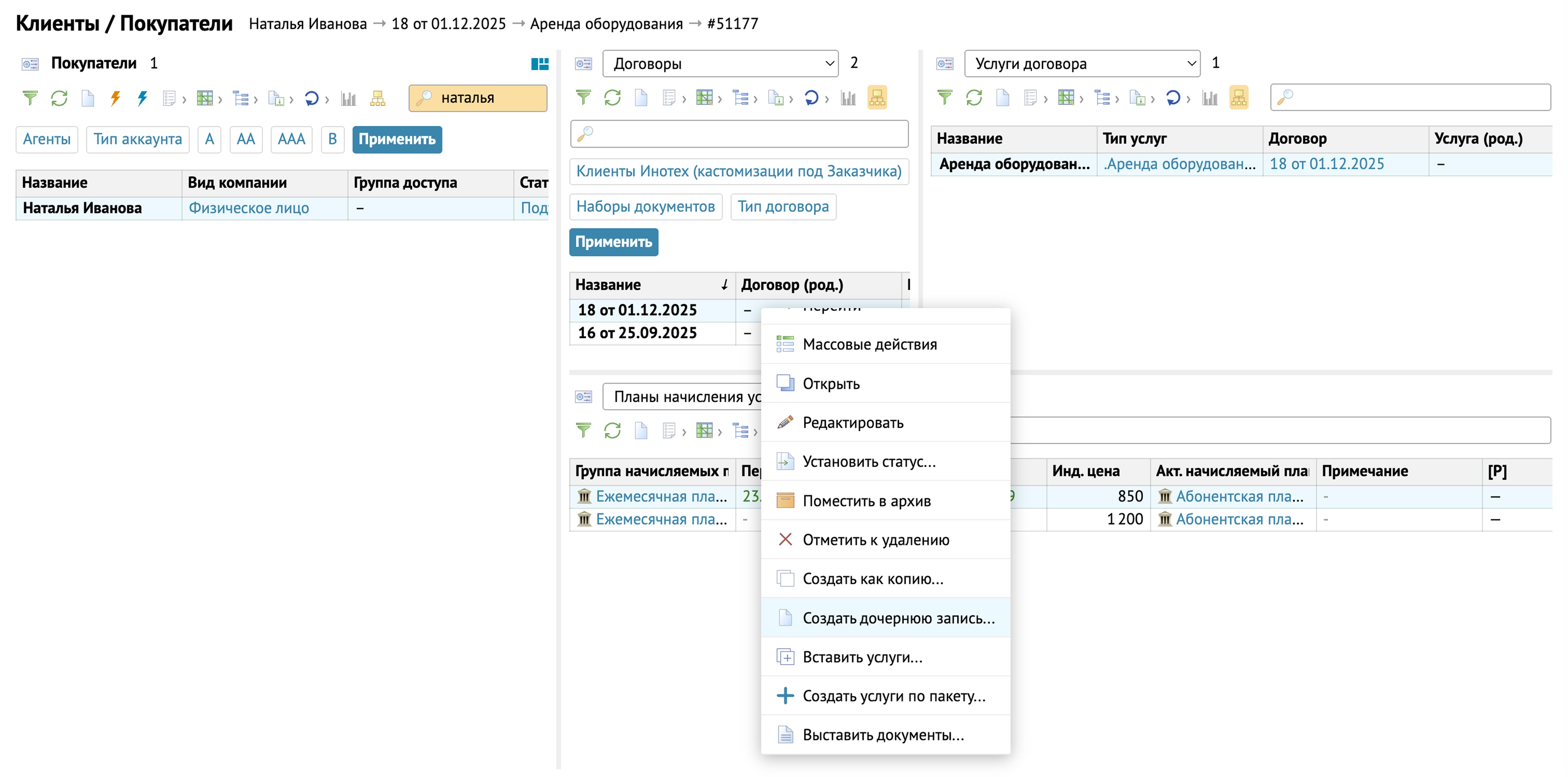 В большинстве таблиц при выборе записи можно увидеть цепочку привязок, как в примере с лицевым счетом: у покупателя есть лицевой счет, к лицевому счету привязывается договор, у договора есть услуги, а у услуг, в свою очередь, планы услуги.