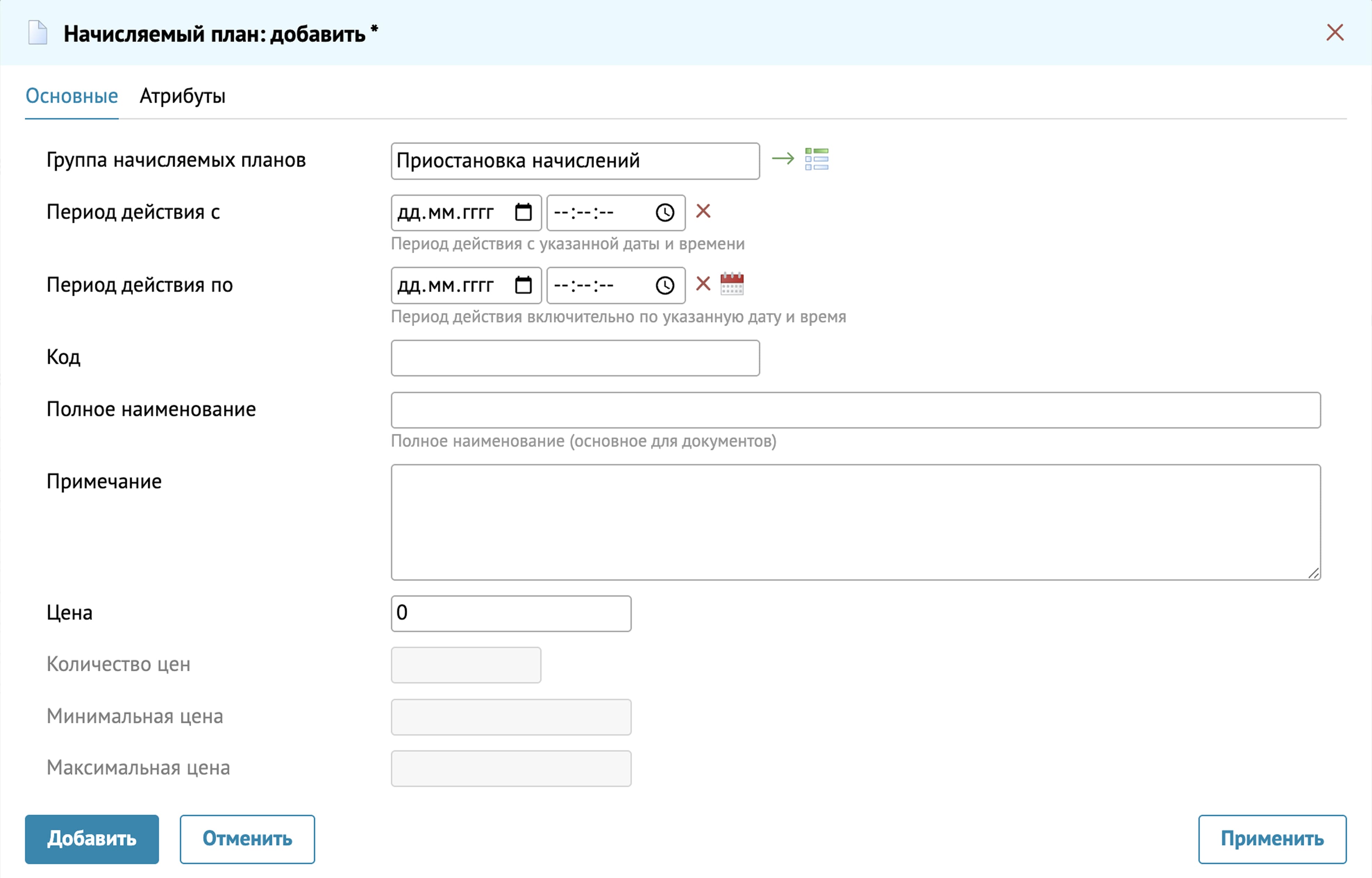 Далее этой группе нужно добавить Начисляемый план стоимостью 0 рублей.