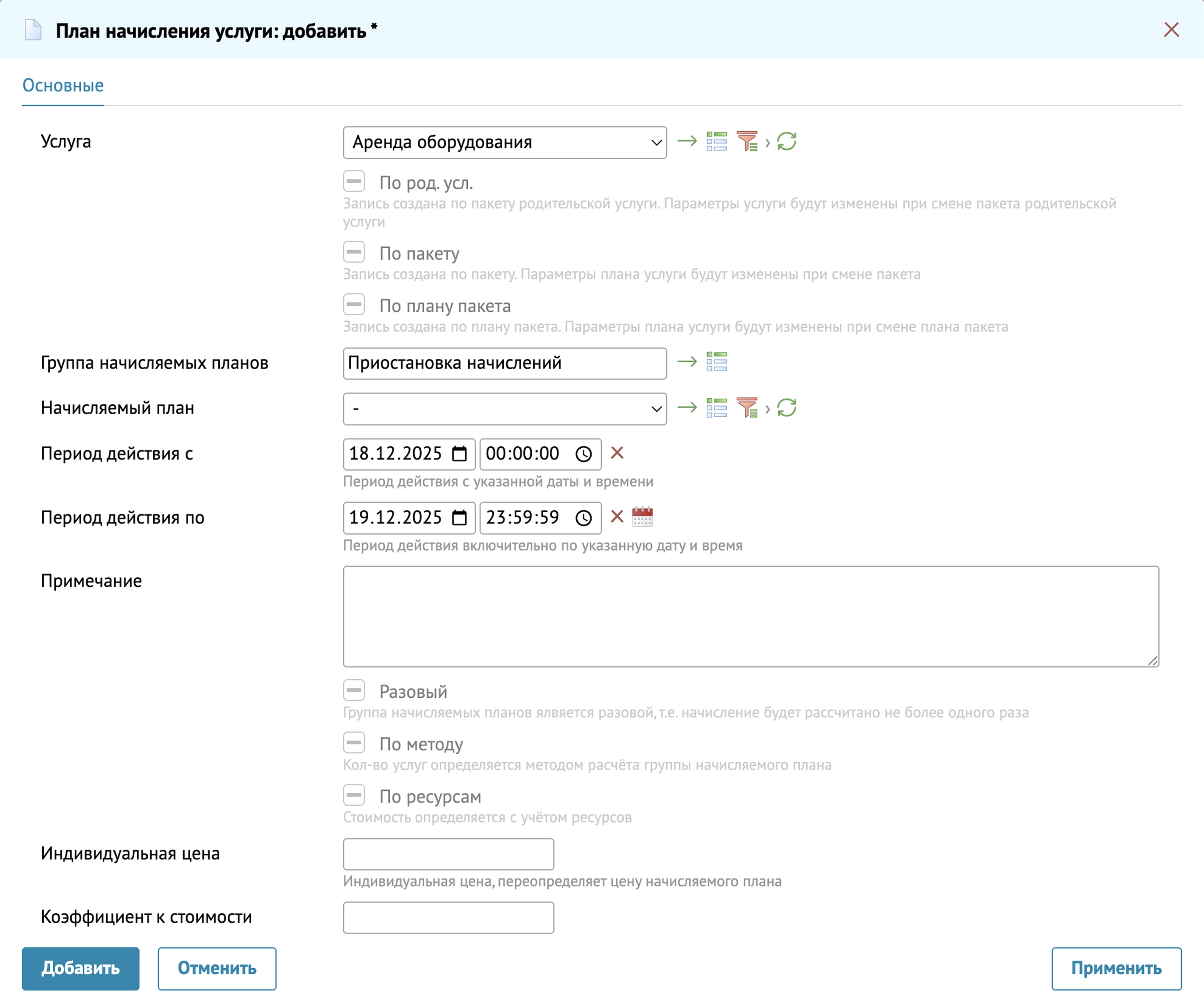 Если по одной и той же услуге заведено несколько планов начисления с пересекающимися периодами, система автоматически распределяет начисления по времени и учитывает приоритет более узких периодов.